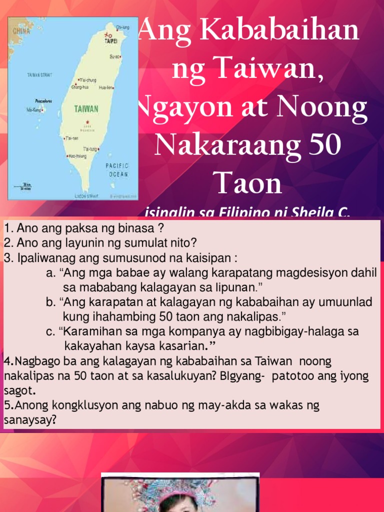 Buod ng ang kababaihan ng taiwan ngayon at noong nakaraang 50 taon. 10032021 AngKababaihan ng Taiwan Noon at Ngayon at Noong Nakalipas na 50 Taon ni Sheila C. At PAGBIBIGAY KAPANGYARIHAN SA KABABAIHANG PILIPINO SA - 1898541 fiona1955 fiona1955 08102018.