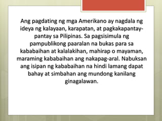 Sa tahanan unang natutuhan ang sistema ng edukasyon. Ano ang gampanin ng babae at lalaki sa panahon ng amerikano.
